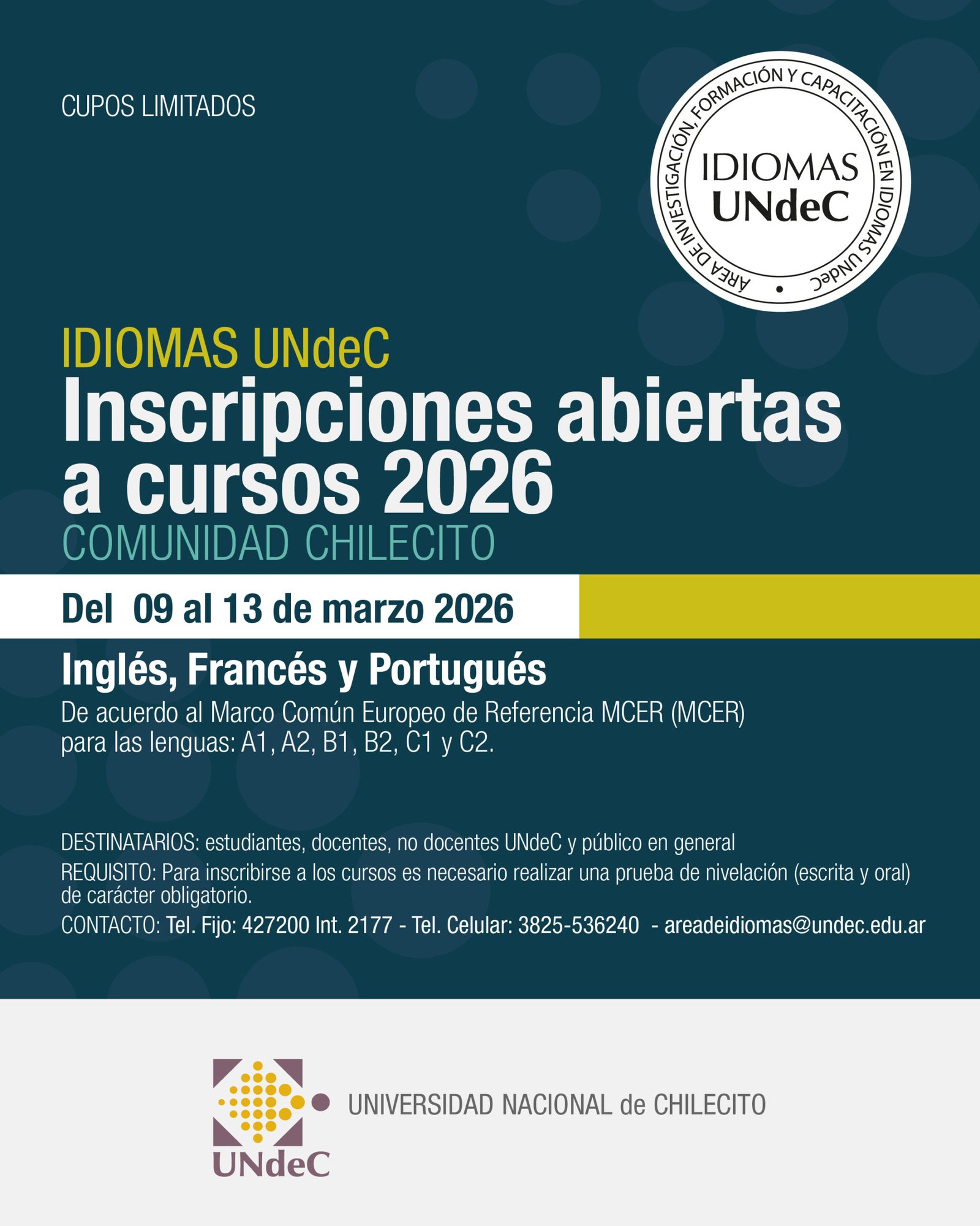 La Universidad Nacional de Chilecito informa que se encuentran abiertas las inscripciones para los cursos anuales gratuitos de Idiomas 2026, destinados a estudiantes, docentes, nodocentes de la universidad y al público en general del departamento Chilecito.