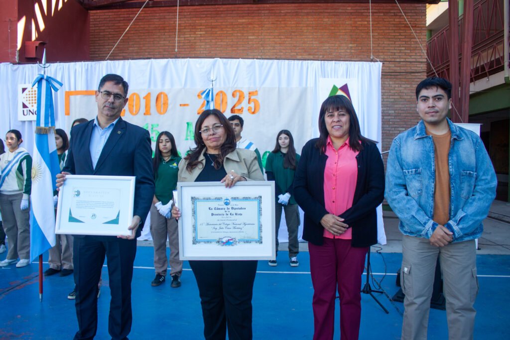 Para finalizar, la diputada provincial, Gabriela Rodríguez y el concejal y egresado del Colegio, Nicolás Brizuela hicieron entrega al rector Salcedo y la vicedirectora Acevedo de dos cuadros con copia de la Declaración de Interés Departamental Nº 417/25 y pcial  Nº 61/140  al 15 aniversario del CoNAg.