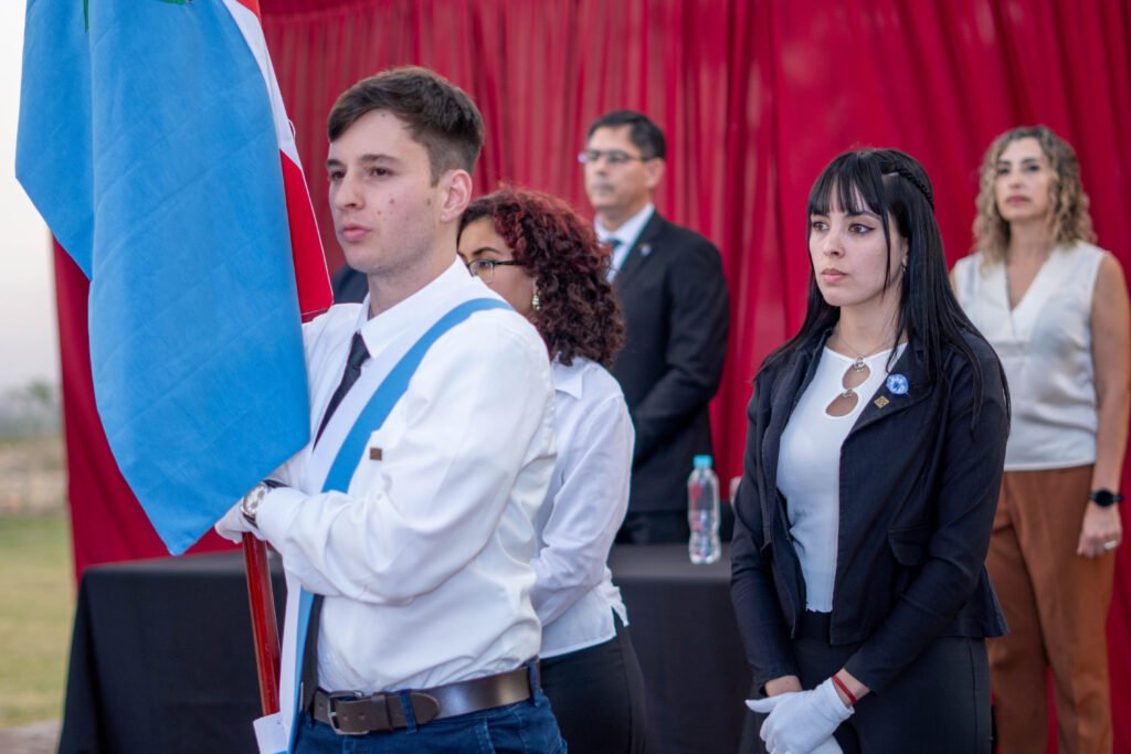 Luego, se realizó el tradicional traspaso de la bandera de ceremonia: Fabricio Ángel Ochonga, egresado de la Licenciatura en Economía, entregó el pabellón nacional a Yanina del Rosario Mercado, estudiante de la Licenciatura en Enfermería.
