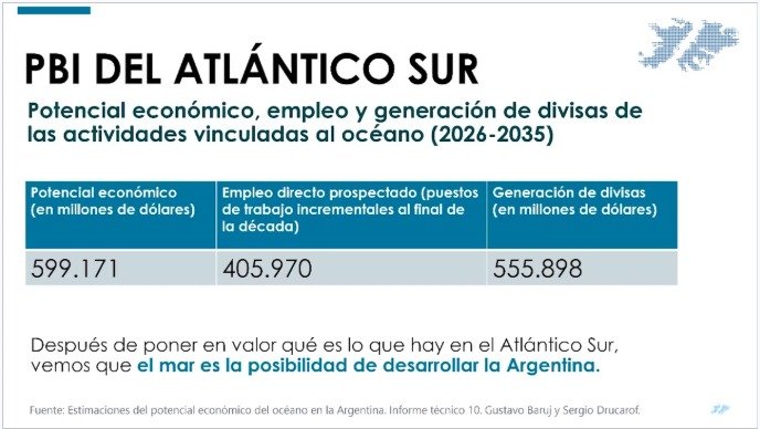 Además a partir de la implementación del mapa bicontinental que ubica a las Islas Malvinas como el centro de nuestro país, entre la extensión sudamericana y antártica, hace que la extensión total sea de 1.782.000 km2 , donde las actividades vinculadas al Atlántico Sur reportan un potencial económico de casi 600 mil millones de dólares, la generación de divisas por exportaciones de 555 mil millones de dólares y la generación de 400 mil puestos de trabajo. Y en lo que se refiere a hidrocarburos en particular, se estima que en la cuenca de Malvinas se pueden extraer entre 180 y 200 mil millones de barriles de petróleo. Haciendo una cuenta estimativa, se trata de 15 billones de dólares norteamericanos, que el Reino Unido está buscando poder explotar de manera unilateral.