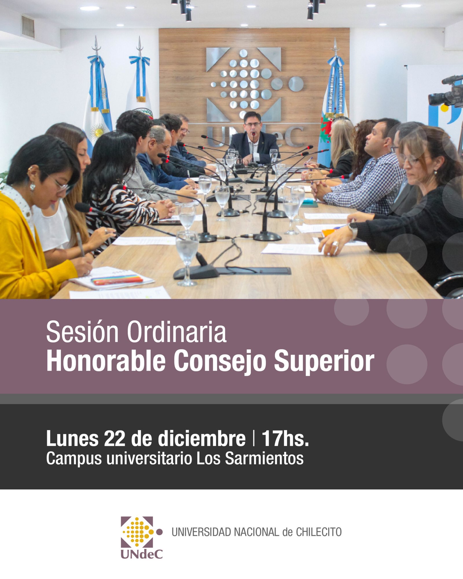 La Universidad Nacional de Chilecito (UNdeC) informa que la última sesión del Consejo Superior del año 2025 se llevará a cabo el lunes 22 de diciembre a las 17 horas, en la Sala del Consejo Superior, ubicada en el Campus Los Sarmientos.