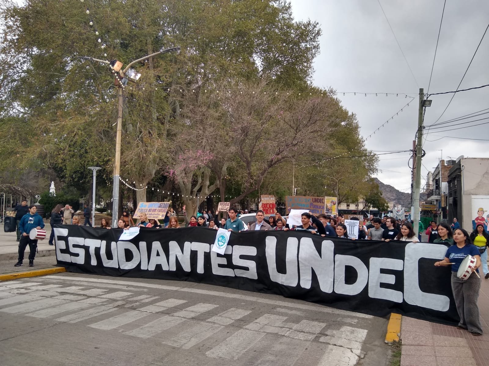 En Chilecito, la movilización se llevó a cabo a las 11 de la mañana y tuvo una altísima participación de estudiantes, docentes, nodocentes y vecinos que acompañaron a la Universidad Nacional de Chilecito en el reclamo. La columna recorrió las calles céntricas con banderas, pancartas y consignas en defensa de la universidad pública y gratuita.