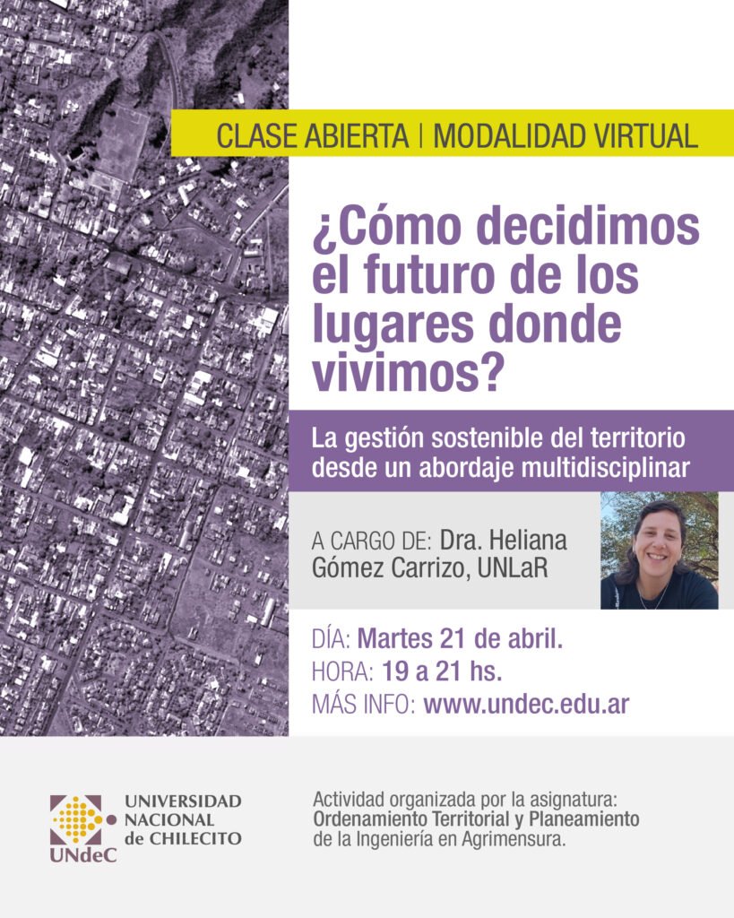 La Universidad, a través de la asignatura Ordenamiento Territorial y Planeamiento de la carrera Ingeniería en Agrimensura, invita a participar de un encuentro académico orientado a reflexionar sobre el ordenamiento territorial y su impacto en el desarrollo de las comunidades. El encuentro se realizará el martes 21 de abril de 2026, de 19:00 a 21:00 (hora argentina), en modalidad virtual a través de videoconferencia.