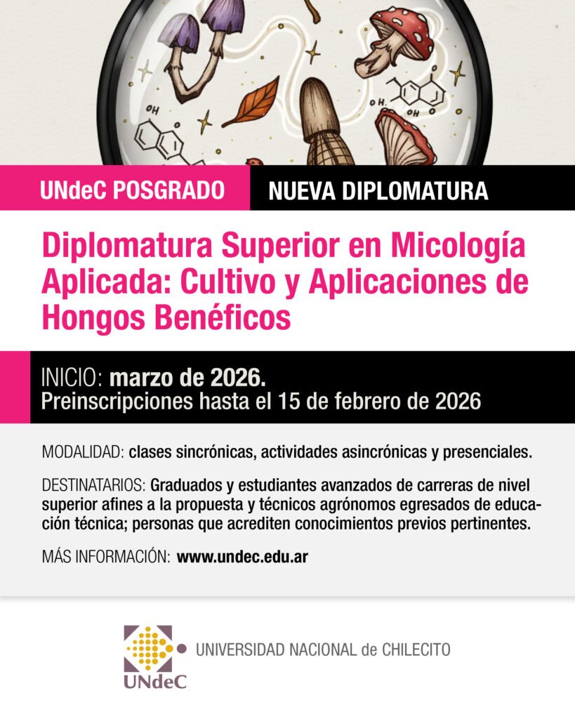 Más información escribiendo a posgrado@undec.edu.ar o consultando en Posgrado: Diplomatura Superior en Micología Aplicada: cultivo y aplicaciones de hongos benéficos