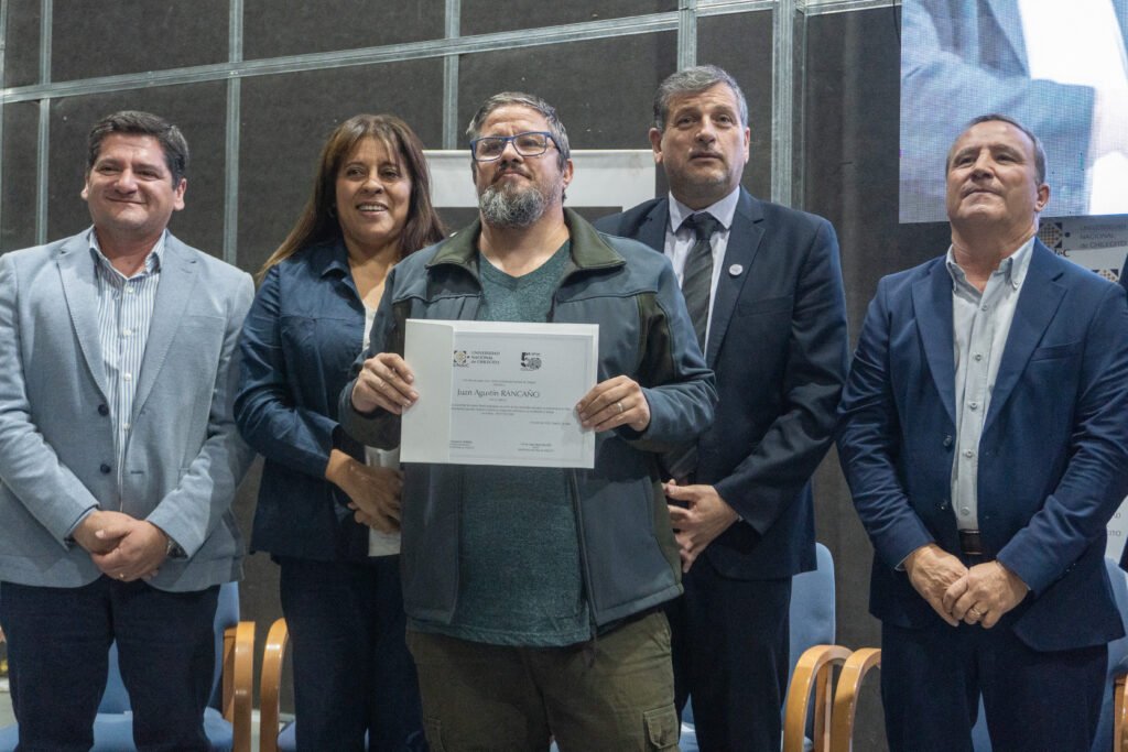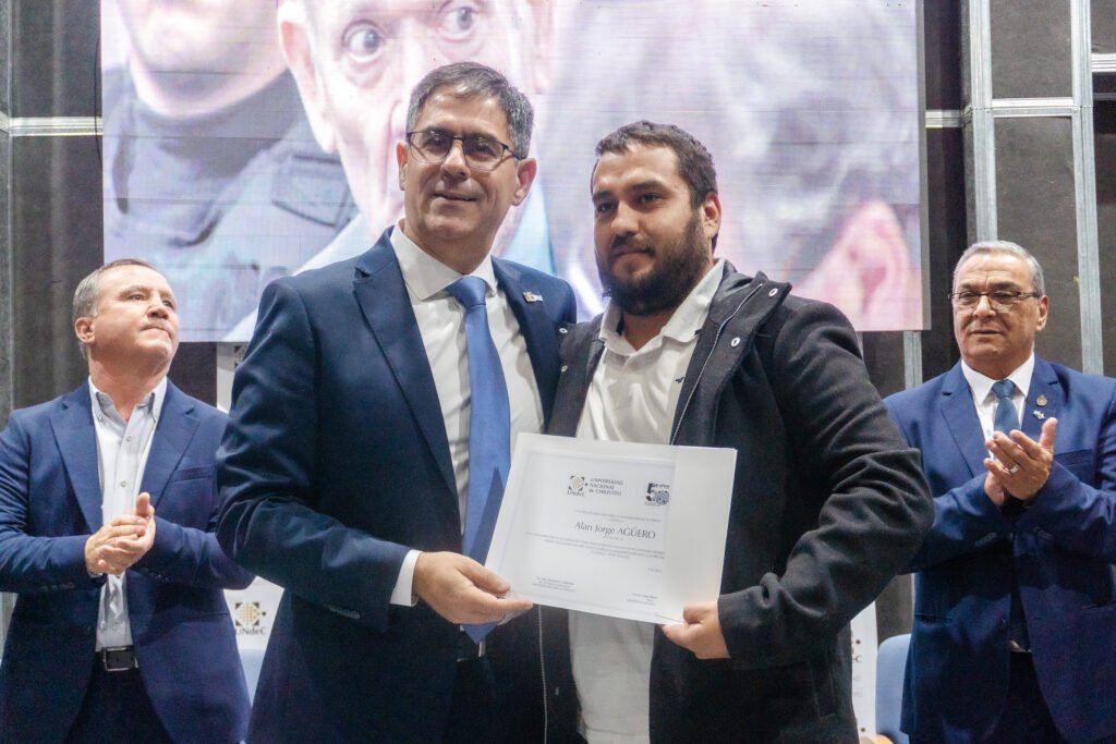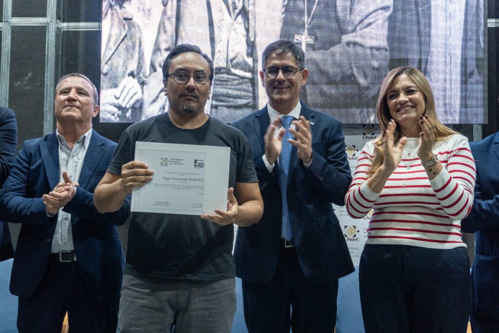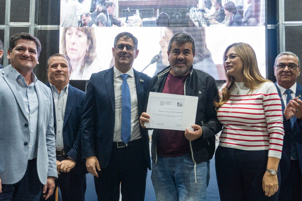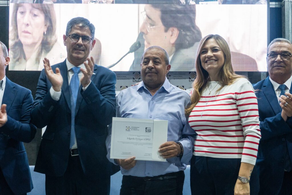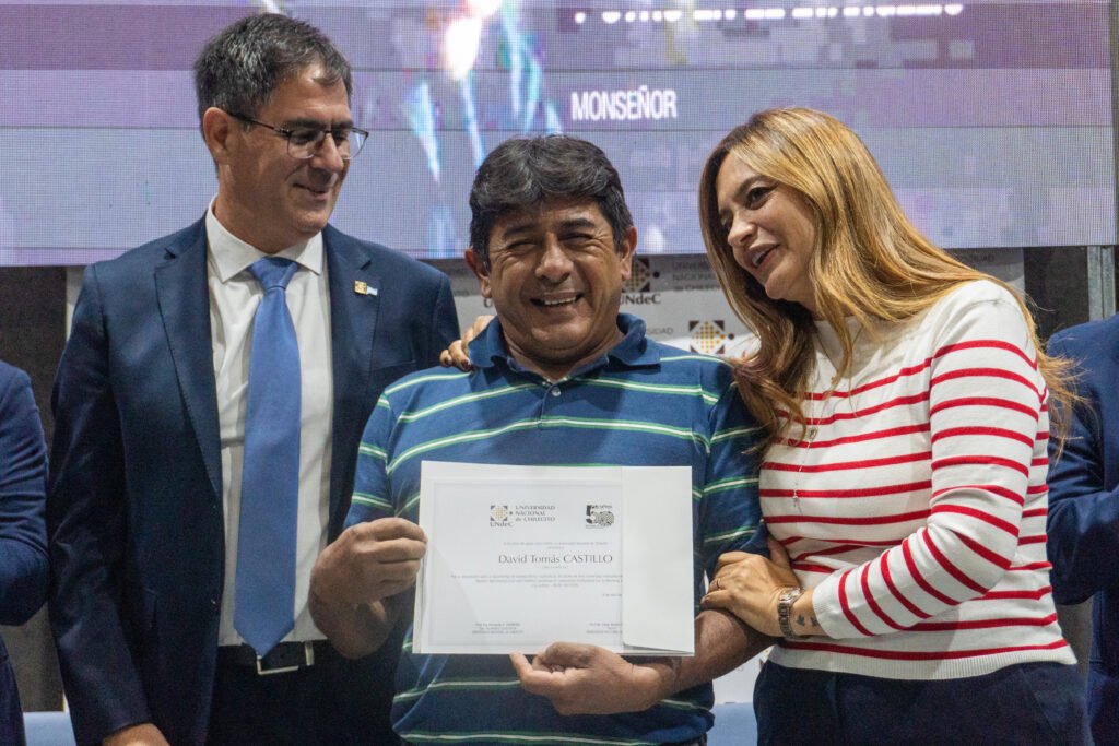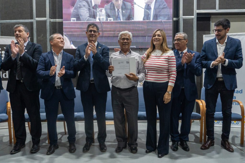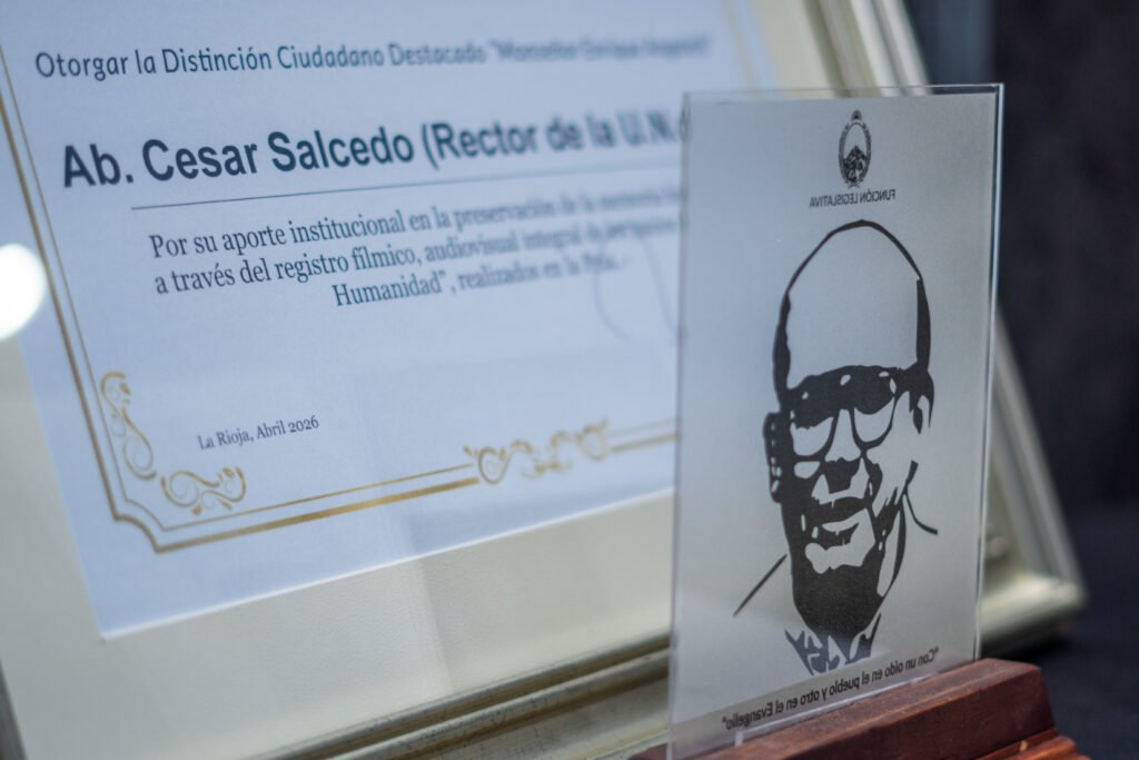 Este martes 7 de abril, en el marco de los 50 años del golpe cívico-militar de 1976 y ante la presencia de la Agrupación Ex Presos Políticos y Familiares de Desaparecidos, la Vicegobernadora de La Rioja Lic. Teresita Madera, junto a legisladores de la Cámara de Diputados y autoridades de la Municipalidad de Chilecito, hizo entrega del Decreto y la Distinción “Monseñor Enrique Angelelli” al Rector de la Universidad Nacional de Chilecito, Ab. Prof. César Salcedo. Asimismo, se entregaron certificados en reconocimiento al compromiso y la labor sostenida del equipo técnico y profesional que garantizó el registro, catalogación y resguardo del material audiovisual, de los juicios de lesa humanidad llevados a cabo en La Rioja.