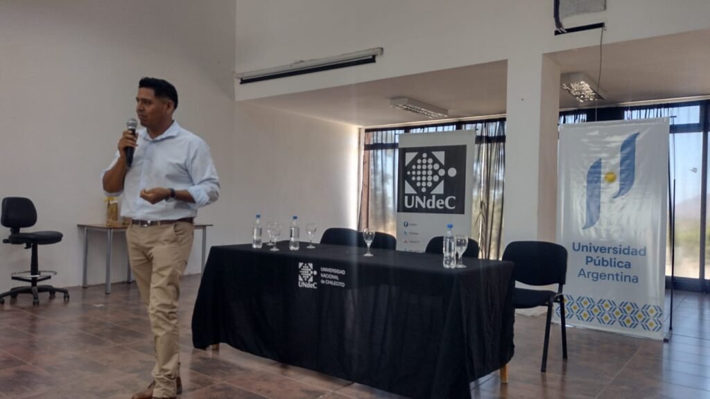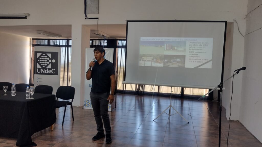 El Lic. Esteban Sanches expuso sobre la enfermería en zonas rurales, narrando su experiencia en Antinaco, un pueblo de 95 habitantes donde el enfermero cumple un rol central en la atención primaria, estabilización y acompañamiento, incluso en condiciones climáticas y geográficas adversas.